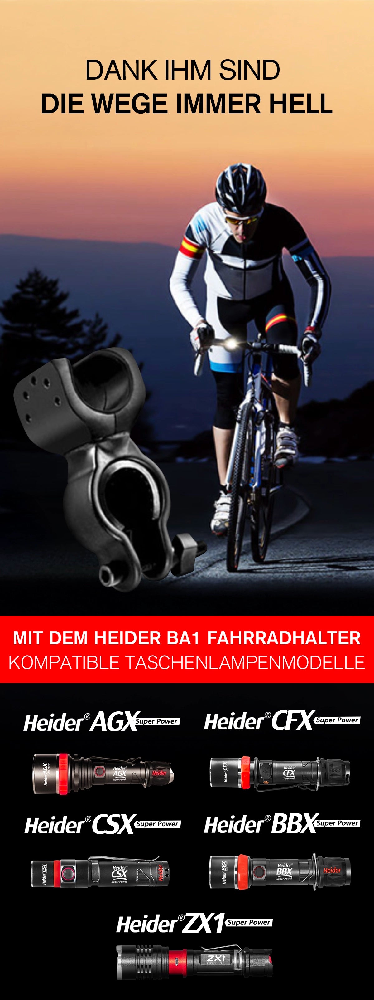 Mit dem Heider BA1 können Sie viele Taschenlampen an Ihrem Fahrrad befestigen. Egal, ob Tag oder Nacht, drinnen oder draußen, genießen Sie das Privileg, Ihr Fahrrad überall hinzufahren, wo Sie möchten.