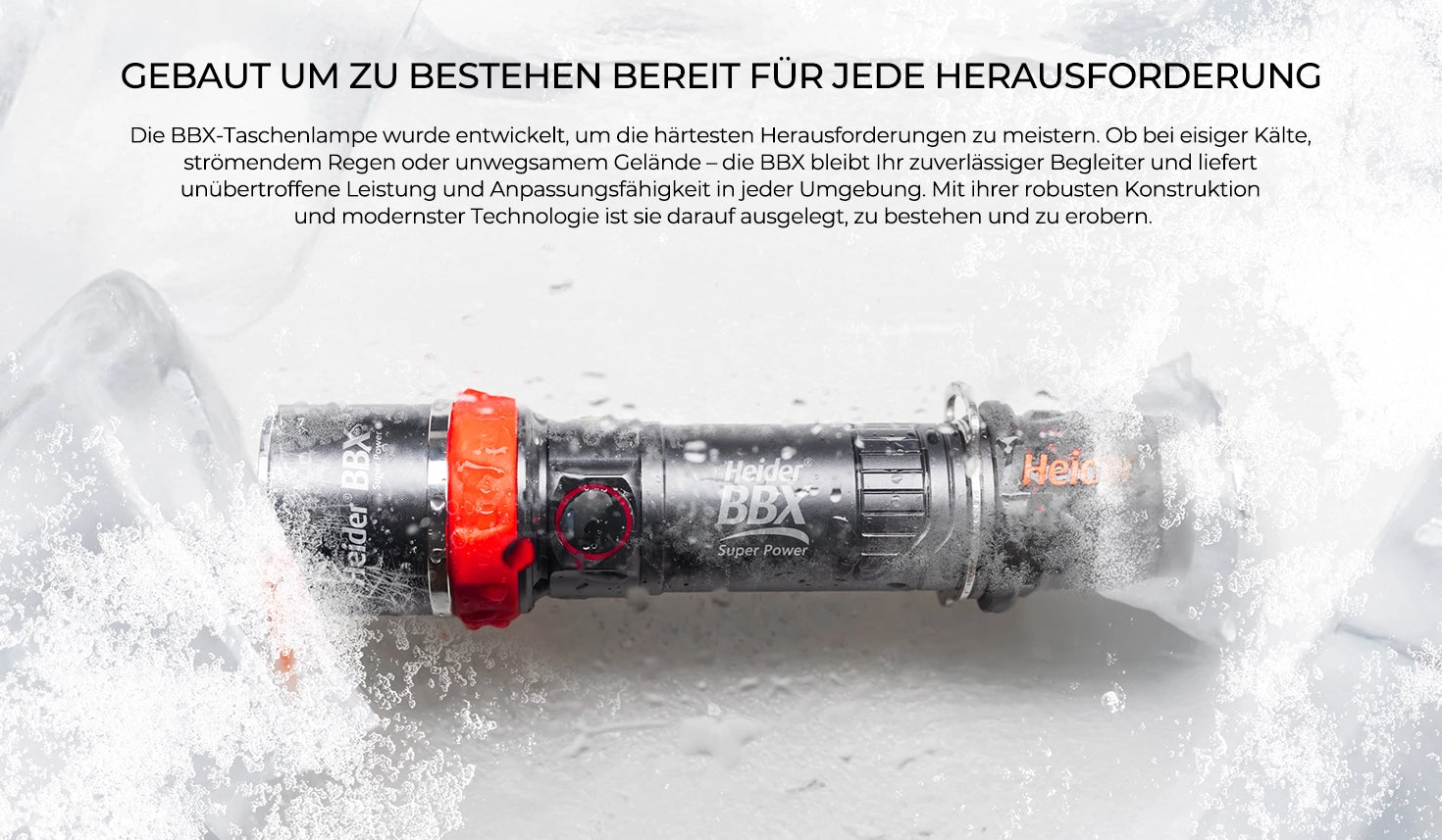 Die Heider BBX ist mit O-Ringen abgedichtet, um sie vor Wasser und Feuchtigkeit zu schützen. Sie können die Heider BBX bis zu 10 Meter unter Wasser und bei allen Wetterbedingungen verwenden. Robust, vielseitig, leistungsstark und stilvoll!