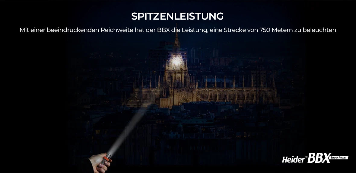 Wie kann ich bestätigen, dass der Heider BBX eine Leuchtweite von bis zu 750 Metern bietet?