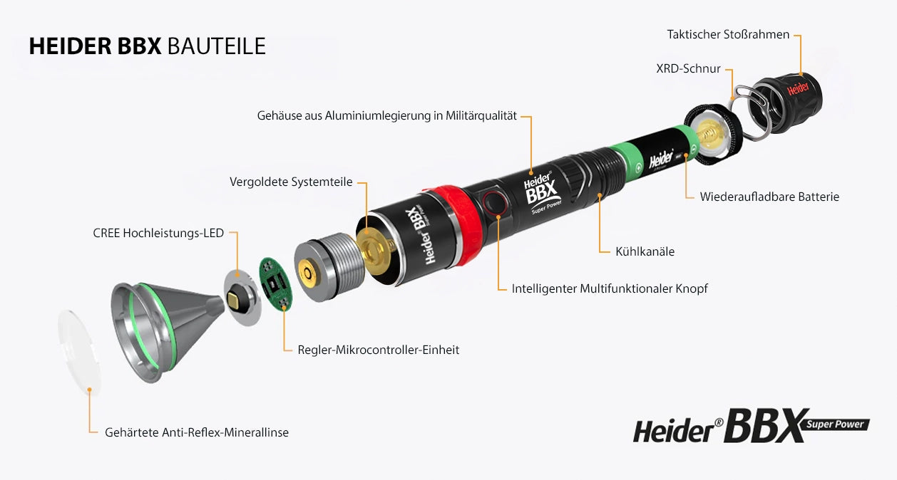 Der Heider BBX Super Power v4 ist mit einer Hochleistungs-HDD 5+3 Mikro-RSL-Treiberschaltung ausgestattet und bietet erhöhte Leistung. Er verfügt über 3 verschiedene versteckte Modi für Notfallsituationen. Mit diesen Lichtmodi können Sie kommunizieren, Ihren Standort markieren und sich sogar gegen unerwartete Angriffe verteidigen.