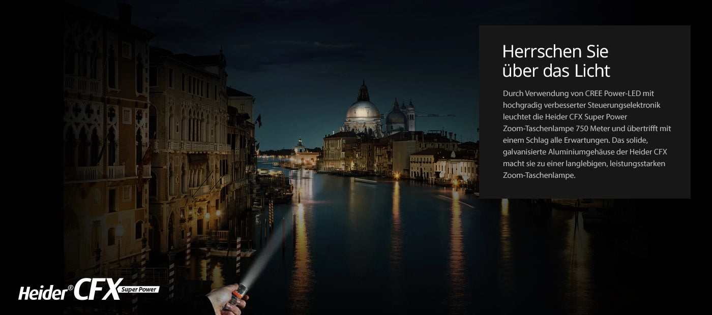 Der Heider CFX ist die leistungsstärkste Zoom-Taschenlampe seiner Klasse. Um Ihre Weitwinkel-Heider-CFX-Taschenlampe in eine leistungsstarke Langstreckenlampe zu verwandeln, verwenden Sie einfach die Zoomfunktion.