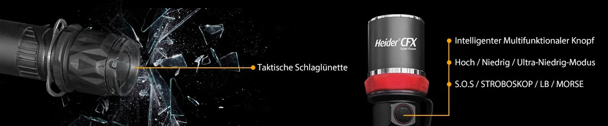 Der Heider CFX Super Power ist so konzipiert, dass er allen äußeren Einflüssen standhält. Das stoßfeste und wasserresistente Gehäuse aus eloxiertem Aluminium schützt die internen Komponenten des CFX. Zusätzlich ist die taktische Spitze auf der Rückseite des Heider CFX in kritischen Situationen äußerst funktional. Hergestellt aus verstärktem Material, ist die taktische Spitze dafür ausgelegt, gehärtetes Glas, Holzplatten und ähnliche Hindernisse zu durchbrechen – sie trägt somit sowohl zur Funktionalität als auch zum Schutz des Gehäuses bei.