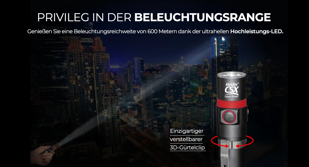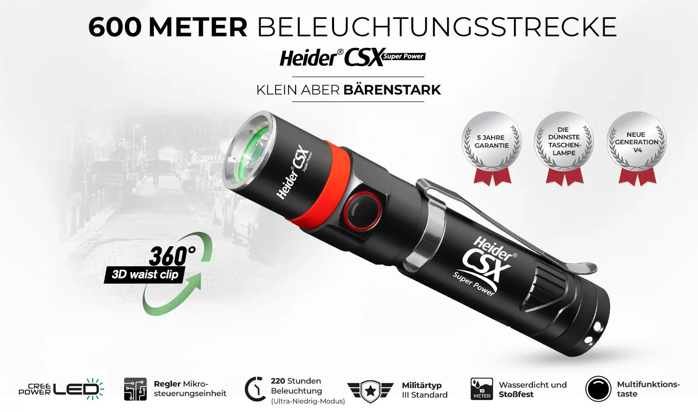 Der Heider CSX V4 ist mit einer Hochleistungs-HDD 5+3 Mikro-RSL-Treiberschaltung ausgestattet und liefert gesteigerte Leistung. Mit seiner beeindruckenden Zoomfunktion bieten diese Lichtmodi eine effektivere Leistung für all Ihre Aktivitäten. Der Heider CSX Super Power V4 ermöglicht bis zu 220 Stunden Beleuchtung im Ultra-Niedrig-Modus.