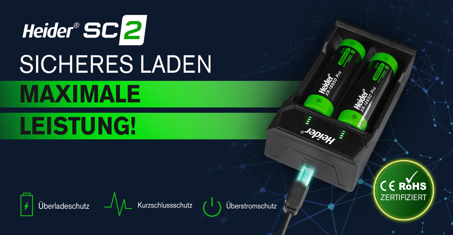 Der Heider SC2 ist mit wiederaufladbaren Batterien in verschiedenen Größen kompatibel. Mit seiner breiten Kompatibilitätsreichweite können Sie ihn nahtlos mit jedem Batterietyp verwenden, den Sie benötigen.
