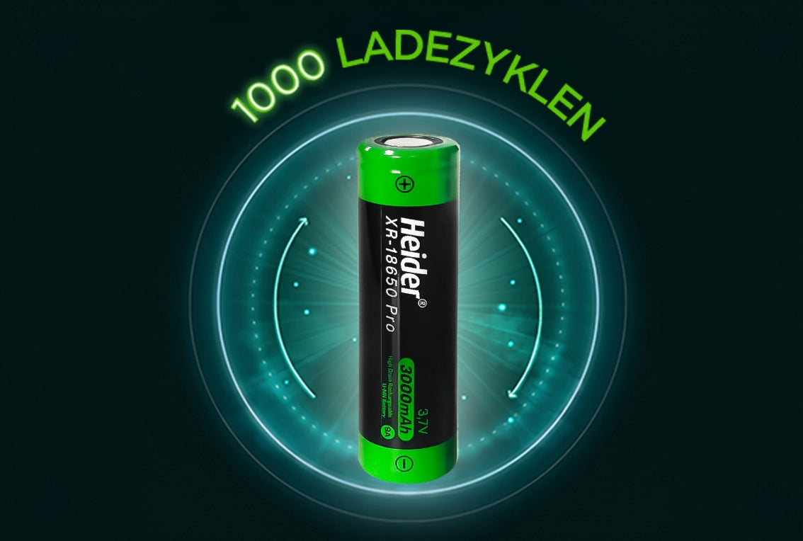 Die Heider XR-18650 Pro Batterie hat 1000 Ladezyklen und bietet eine durchschnittliche Lebensdauer von 3-4 Jahren.