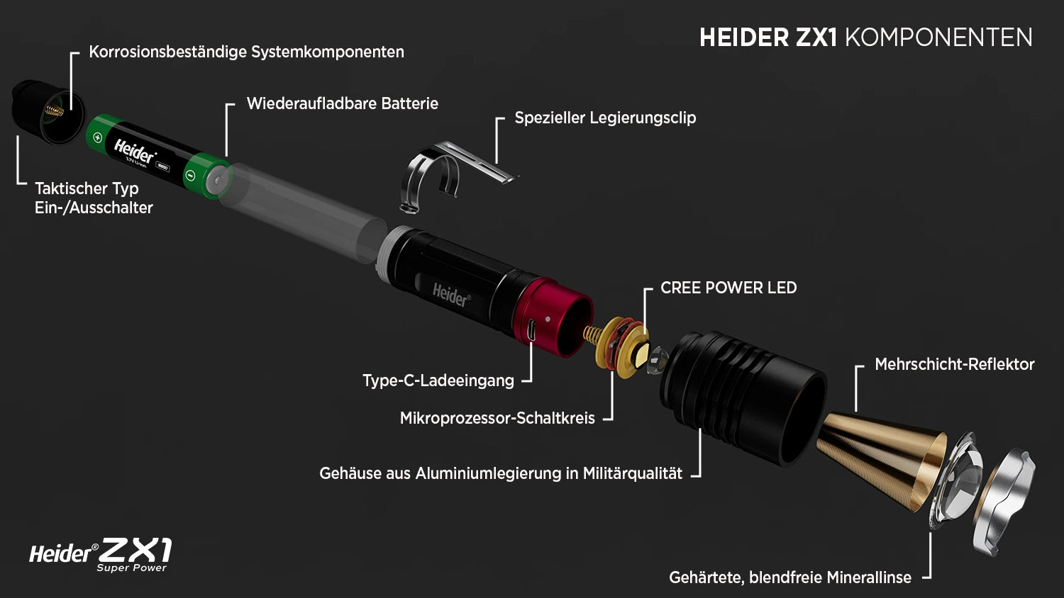 Die Heider ZX1 hält schwierigen Bedingungen stand mit ihrer IP44-Wasserbeständigkeit und stoßfesten Konstruktion, die sicherstellt, dass sie nie im Stich lässt. Ihr harteloxiertes Aluminiumgehäuse kombiniert leichte Bauweise mit Langlebigkeit und bietet eine lang anhaltende Nutzung. Egal, wie herausfordernd die Bedingungen sind, die Heider ZX1 ist immer an Ihrer Seite!