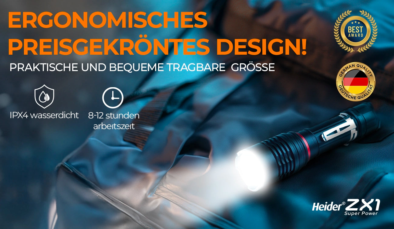 Die HEIDER ZX1 ist eine äußerst langlebige Taschenlampe, da sie wasser- und stoßfest ist.