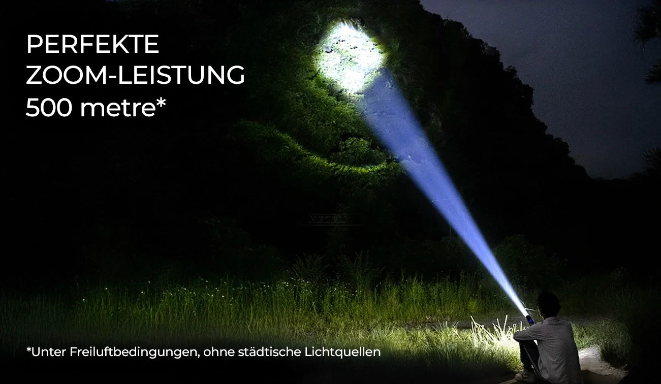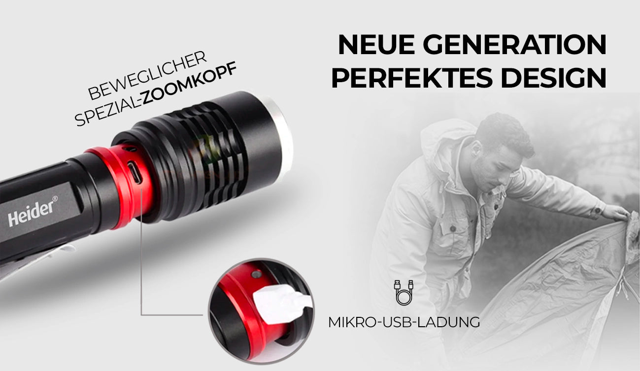 Die Heider ZX1 erhöht Ihre Sicherheit in dunklen Umgebungen mit einer Arbeitsreichweite von bis zu 500 Metern. Die vollständige Zoom-Funktion ermöglicht es Ihnen, den Lichtstrahl nach Bedarf anzupassen, wodurch es einfach wird, sowohl weite Flächen als auch entfernte Bereiche zu beleuchten. Es ist die perfekte Wahl für Bergwandern, Camping oder Nachjagd.