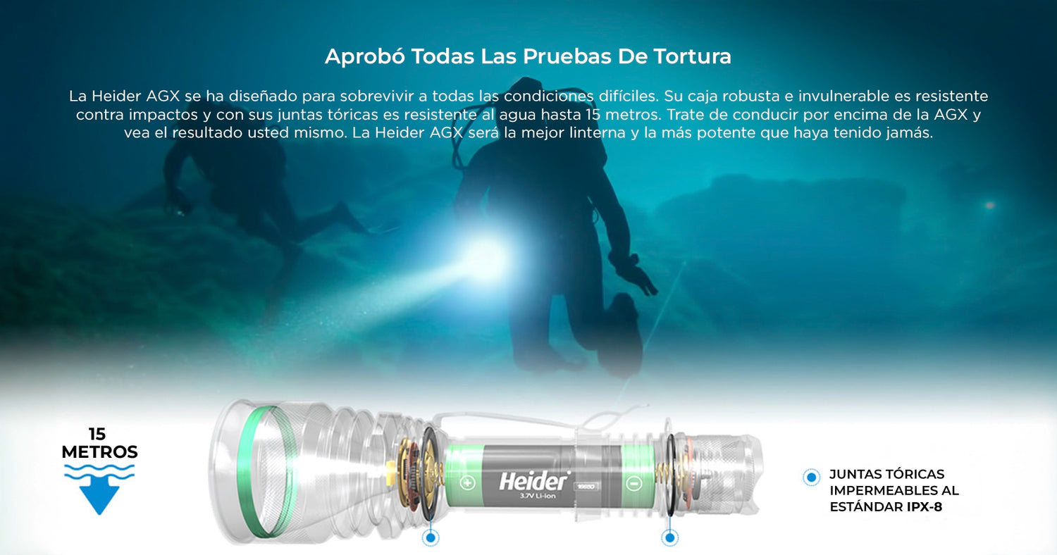 Gracias a los anillos de aislamiento (O-rings) ubicados en sus puntos de conexión, la Heider AGX V4 es resistente al agua hasta una profundidad de 15 metros.