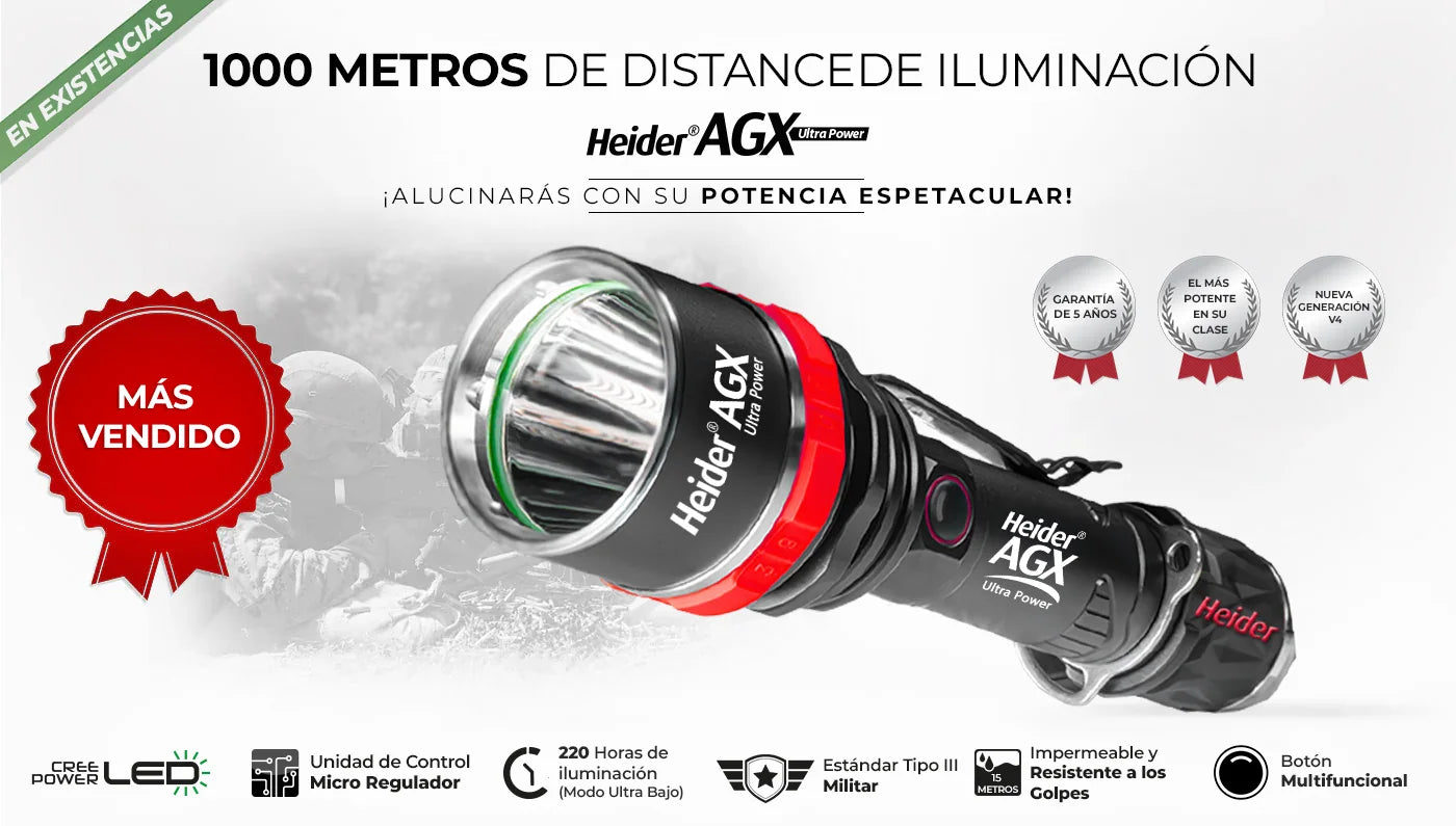 El Heider AGX Ultra Power v4, está equipado con la tecnología CREE Power LED y su balance de blancos está alrededor de 6000-6500 K, lo que se conoce como luz diurna. La lente especial de mineral templado de AGX permite que su haz alcance hasta 1000 metros.
