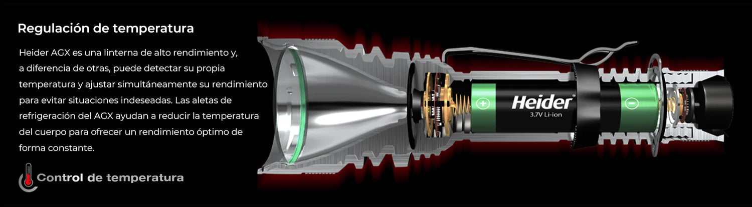La Heider AGX funciona con una batería recargable tipo XR-18650 PRO de 3.7V y 3,000 mAh.