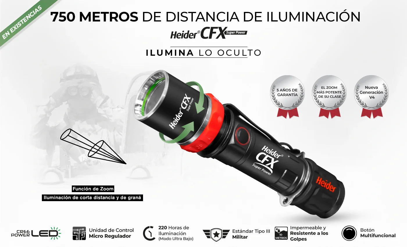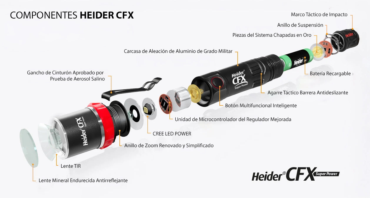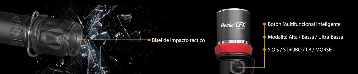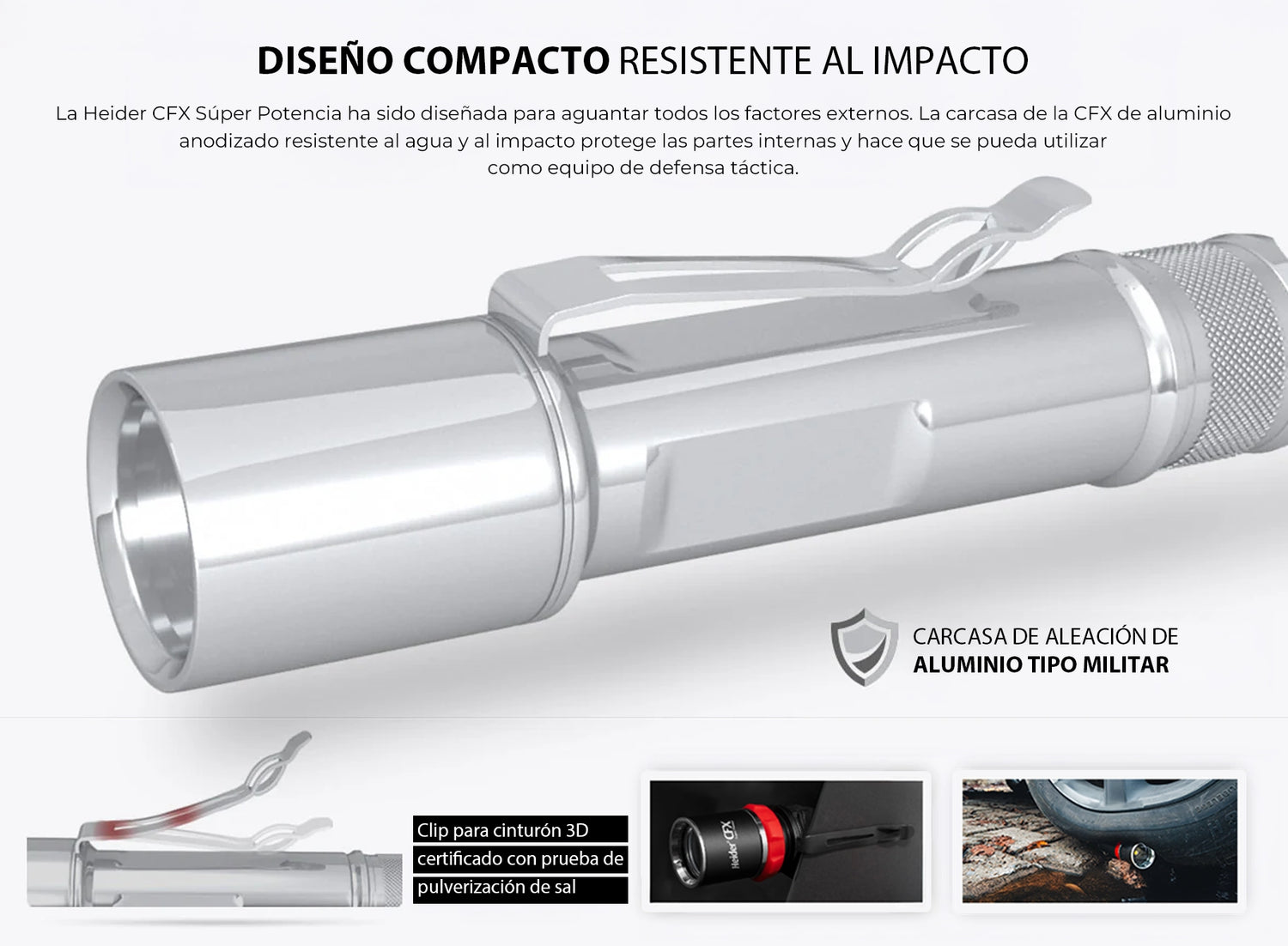 El Heider CFX Super Power está diseñado para resistir todos los factores externos. La carcasa de aluminio anodizado, resistente a los golpes y al agua, protege los componentes internos del CFX. Además, la punta táctica en la parte trasera del Heider CFX es altamente funcional en situaciones críticas. Fabricada con material reforzado, esta punta táctica está diseñada para romper vidrio templado, paneles de madera y obstáculos similares, aportando tanto funcionalidad como protección estructural.