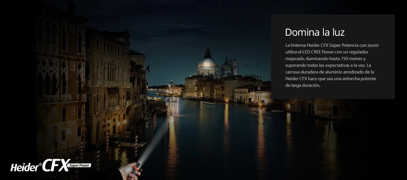 El Heider CFX está equipado con la tecnología CREE Power LED y una lente TIR de corte especial. El CFX Super Power tiene una autonomía de 220 horas en el modo más bajo por carga. Su potencia no es una casualidad, es el diseño definitivo.