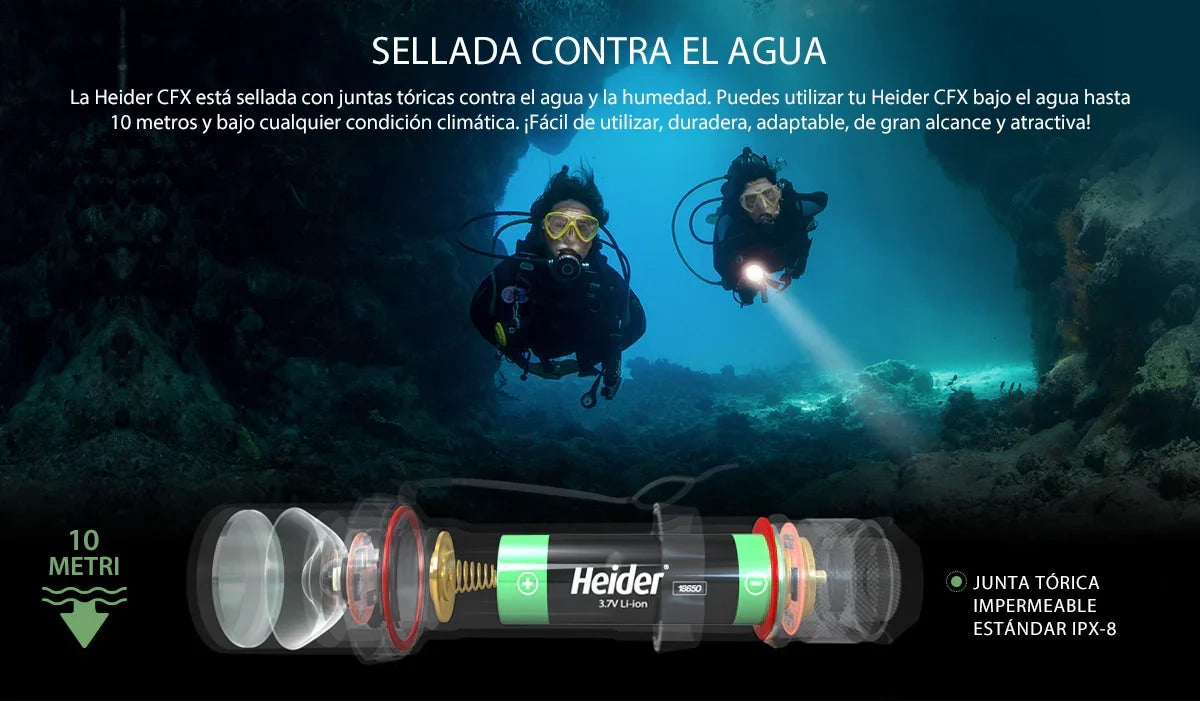 El Heider CFX está sellado con anillos de goma (O-rings) contra el agua y la humedad. Puedes usar el Heider CFX bajo el agua hasta una profundidad de 10 metros y en todo tipo de condiciones climáticas.