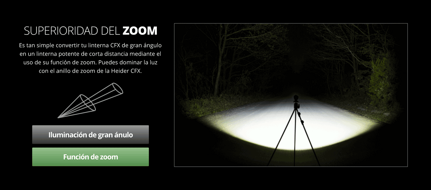 El Heider CFX es la linterna con zoom más potente de su categoría. Para transformar tu linterna Heider CFX de gran angular en una linterna de largo alcance y alta potencia, simplemente utiliza la función de zoom.