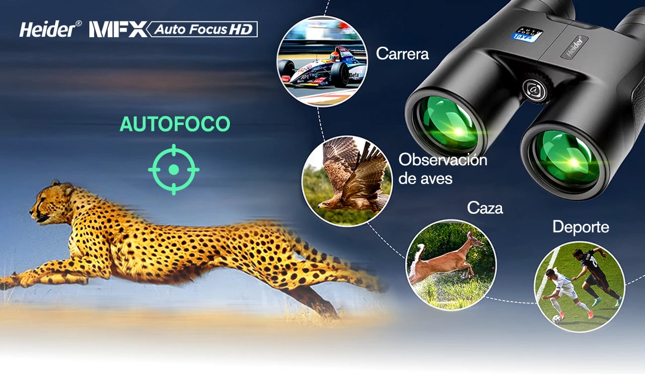 Los binoculares Heider MFX 10x42 Auto Focus con sistema de prisma BaK-4 anti-reflexión ofrecen la vista más realista de la naturaleza. Las lentes de alta calidad proporcionan una claridad excepcional y profundidad tanto a distancias cortas como largas, mientras que los colores vibrantes mejoran tu experiencia de observación. Diseñados para ayudarte a notar incluso los detalles más pequeños, explora la naturaleza en sus verdaderos colores con una visión sin pérdidas.