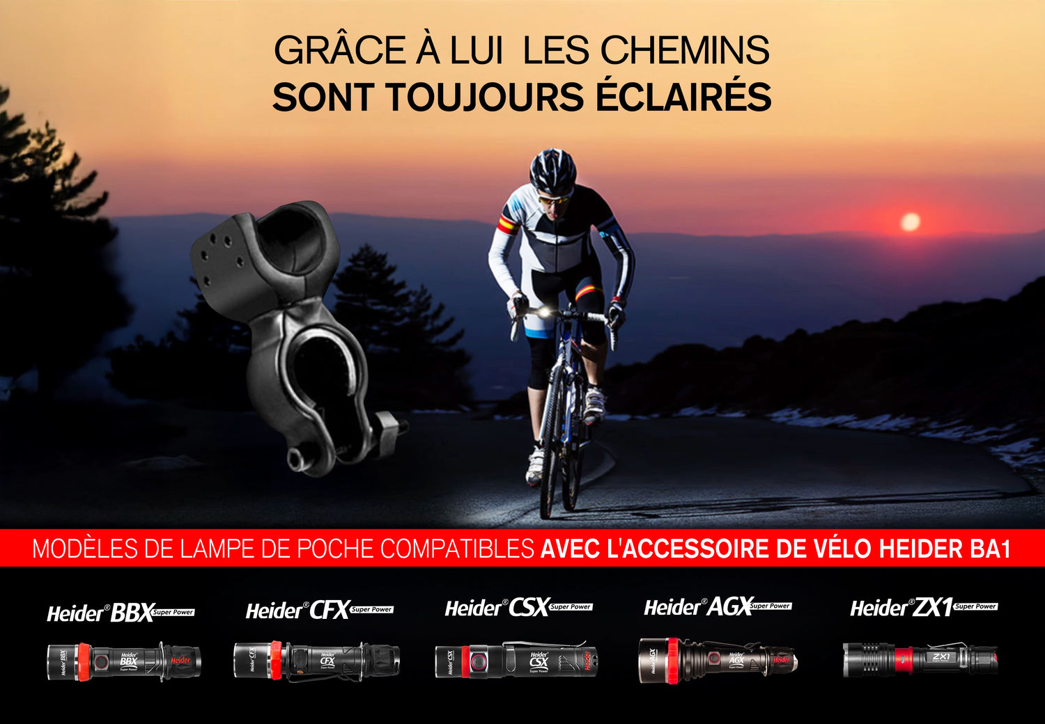 Avec le Heider BA1, vous pouvez fixer de nombreuses lampes de poche à votre vélo. De jour comme de nuit, à l'intérieur ou à l'extérieur, profitez du privilège de rouler à vélo où vous le souhaitez