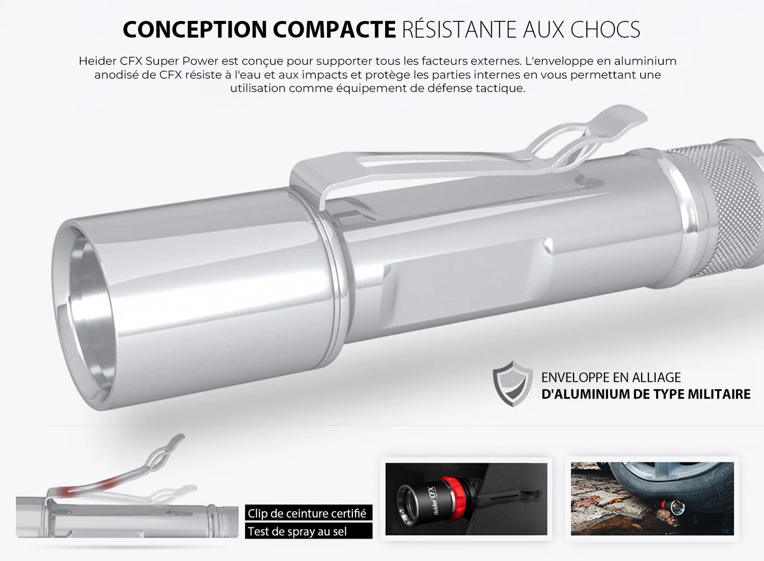 La lampe torche Heider CFX est équipée de la technologie LED CREE Power avec une lentille TIR spécialement découpée. La lampe torche CFX Super Power offre 220 heures d'autonomie en mode le plus bas par charge. Sa puissance n'est pas une coïncidence, c'est le nec plus ultra en matière de conception.