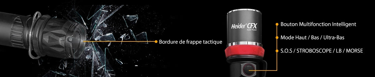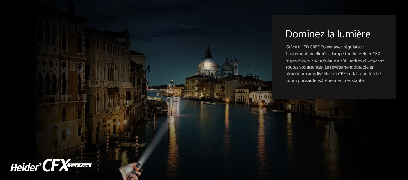 Le Heider CFX est la lampe torche à zoom la plus puissante de sa catégorie. Pour transformer votre lampe torche Heider CFX à grand angle en une lampe longue portée puissante, il suffit d’utiliser la fonction de zoom.