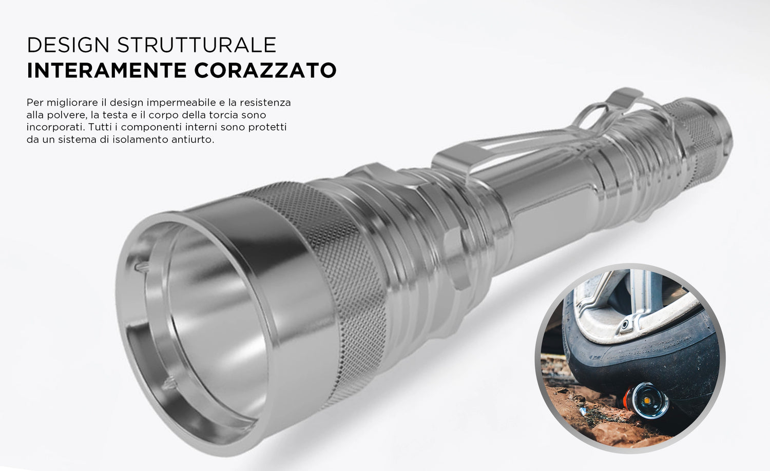 La Heider AGX V4 è dotata di un corpo integrato corazzato, il che significa che la sua struttura monoblocco offre una protezione totale contro gli impatti. Cadute, carichi pesanti o persino il passaggio di un’auto non compromettono la sua funzionalità. Inoltre, la punta tattica situata nella parte posteriore è estremamente utile in situazioni critiche. Realizzata con materiale rinforzato, è progettata per rompere vetri temperati, pannelli in legno e altri ostacoli simili, contribuendo sia alla funzionalità sia alla protezione del corpo torcia.