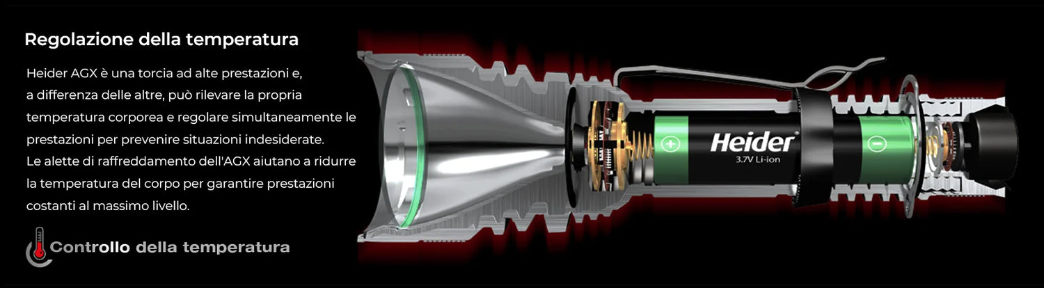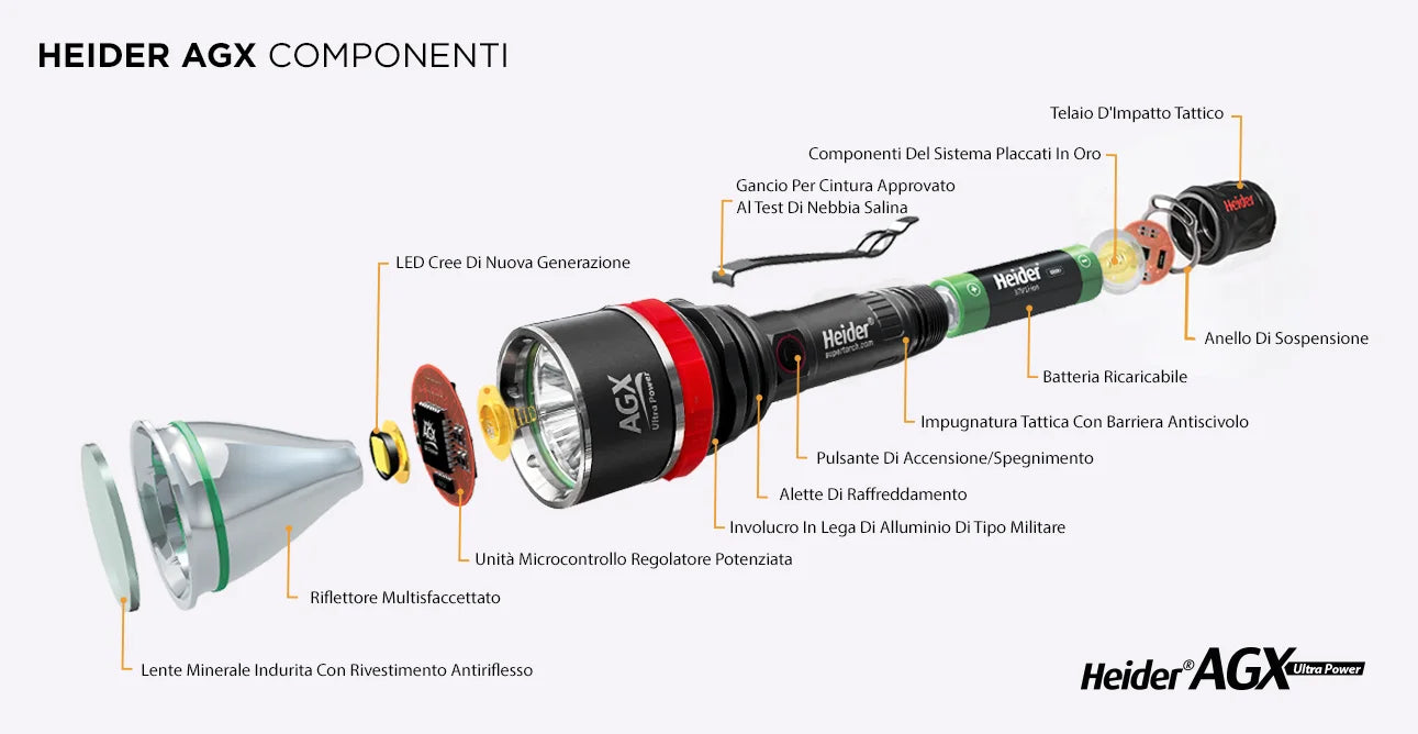 La Heider AGX Ultra Power v4, è dotata di tecnologia LED CREE Power, con un bilanciamento del bianco di circa 6000-6500 K, equivalente alla luce del giorno. La lente minerale temperata a taglio speciale dell'AGX permette al suo fascio luminoso di raggiungere 1000 metri.