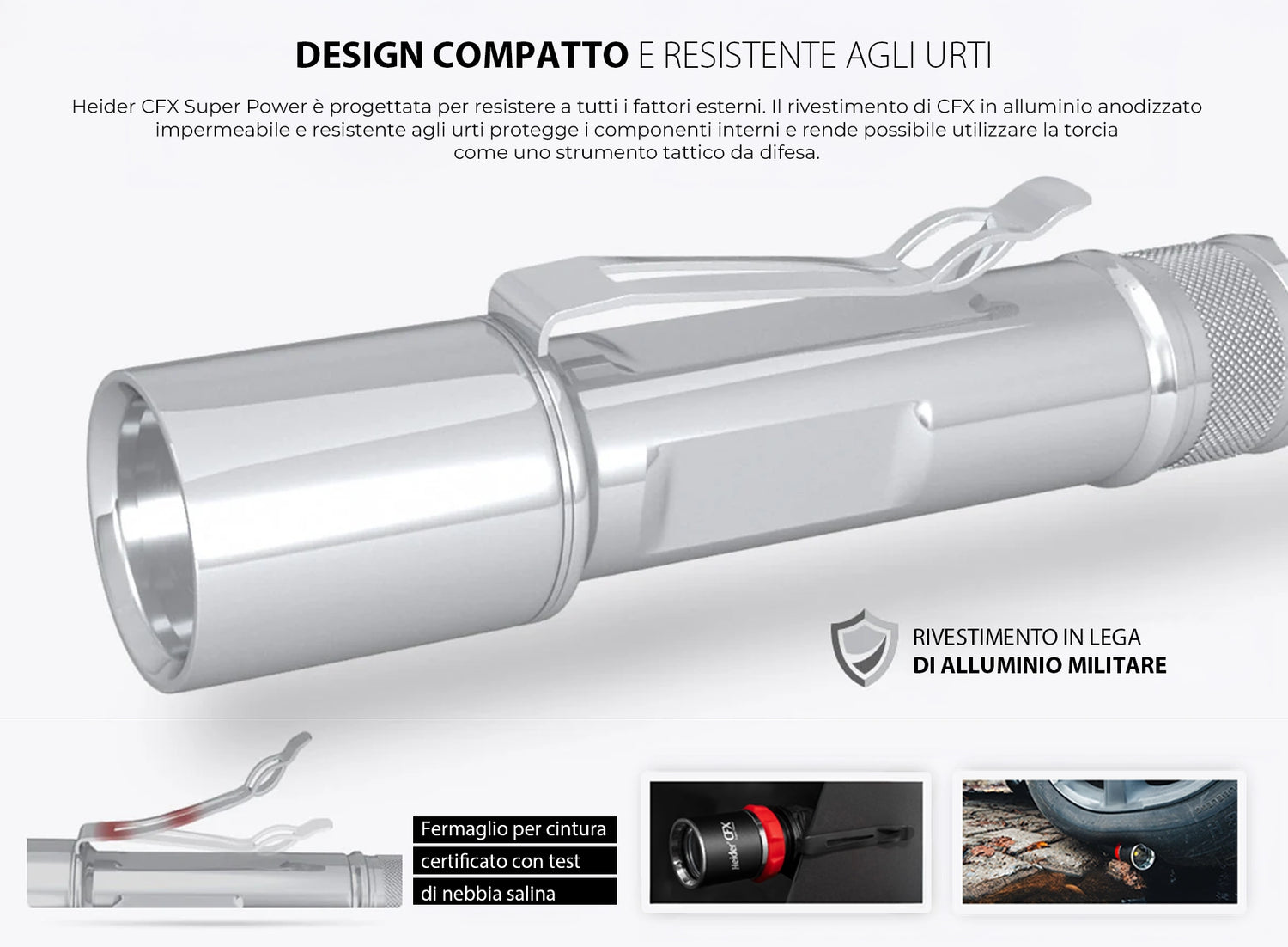 Il Heider CFX Super Power è progettato per resistere a tutti i fattori esterni. La scocca in alluminio anodizzato, resistente agli urti e all’acqua, protegge i componenti interni del CFX. Inoltre, la punta tattica posta sul retro del Heider CFX è altamente funzionale in situazioni critiche. Realizzata in materiale rinforzato, la punta tattica è progettata per rompere vetri temperati, pannelli in legno e ostacoli simili, contribuendo sia alla funzionalità che alla protezione del corpo.