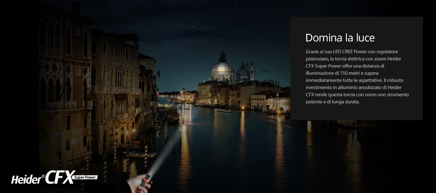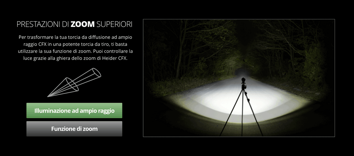 Il Heider CFX è la torcia con zoom più potente della sua categoria. Per trasformare la tua torcia Heider CFX grandangolare in una torcia potente a lungo raggio, utilizza semplicemente la funzione zoom.
