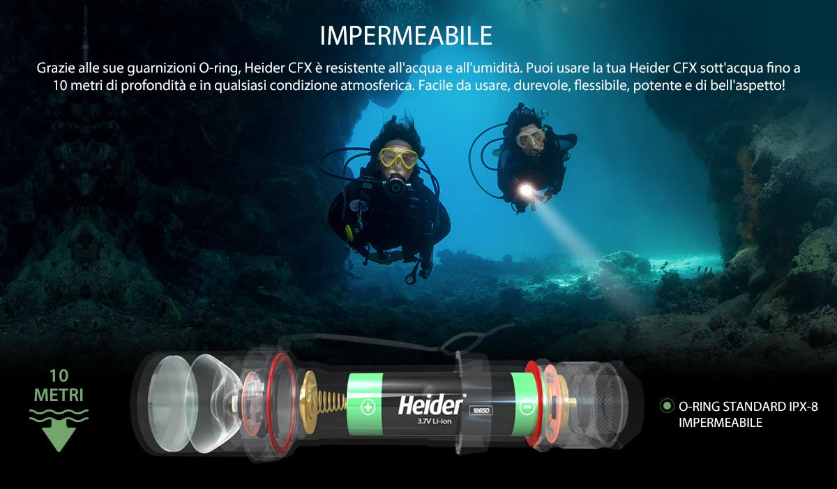 Il Heider CFX è sigillato con O-ring contro acqua e umidità. Puoi utilizzare il Heider CFX sott’acqua fino a una profondità di 10 metri e in tutte le condizioni atmosferiche.