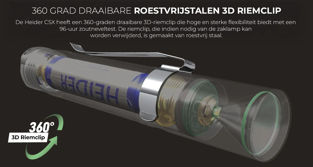 Met een IPX-7 waterdichte behuizing is de Heider CSX waterdicht tot 10 meter.