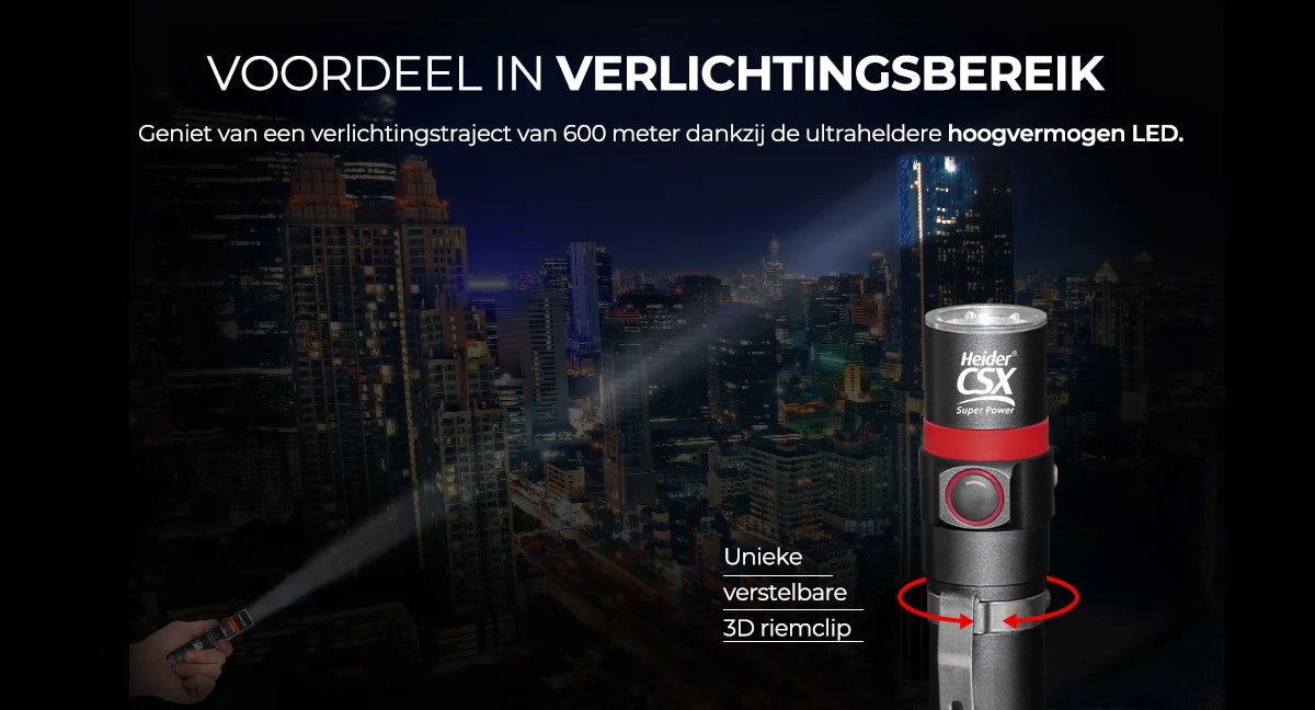 Hoe kan ik bevestigen dat de Heider CSX een verlichtingsbereik tot 600 meter biedt?