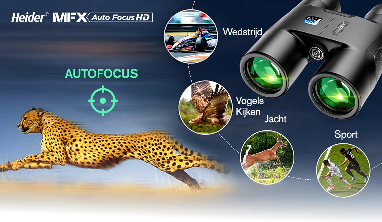 De Heider MFX 10x42 Auto Focus verrekijker met anti-reflectie BaK-4 prisma systeem biedt het meest realistische beeld van de natuur. Hoogwaardige lenzen bieden uitzonderlijke helderheid en diepte op zowel korte als lange afstanden, terwijl levendige kleuren uw observatie-ervaring naar een hoger niveau tillen. Ontworpen om u te helpen zelfs de kleinste details op te merken, de natuur te verkennen in zijn ware kleuren met verliesloos zicht.