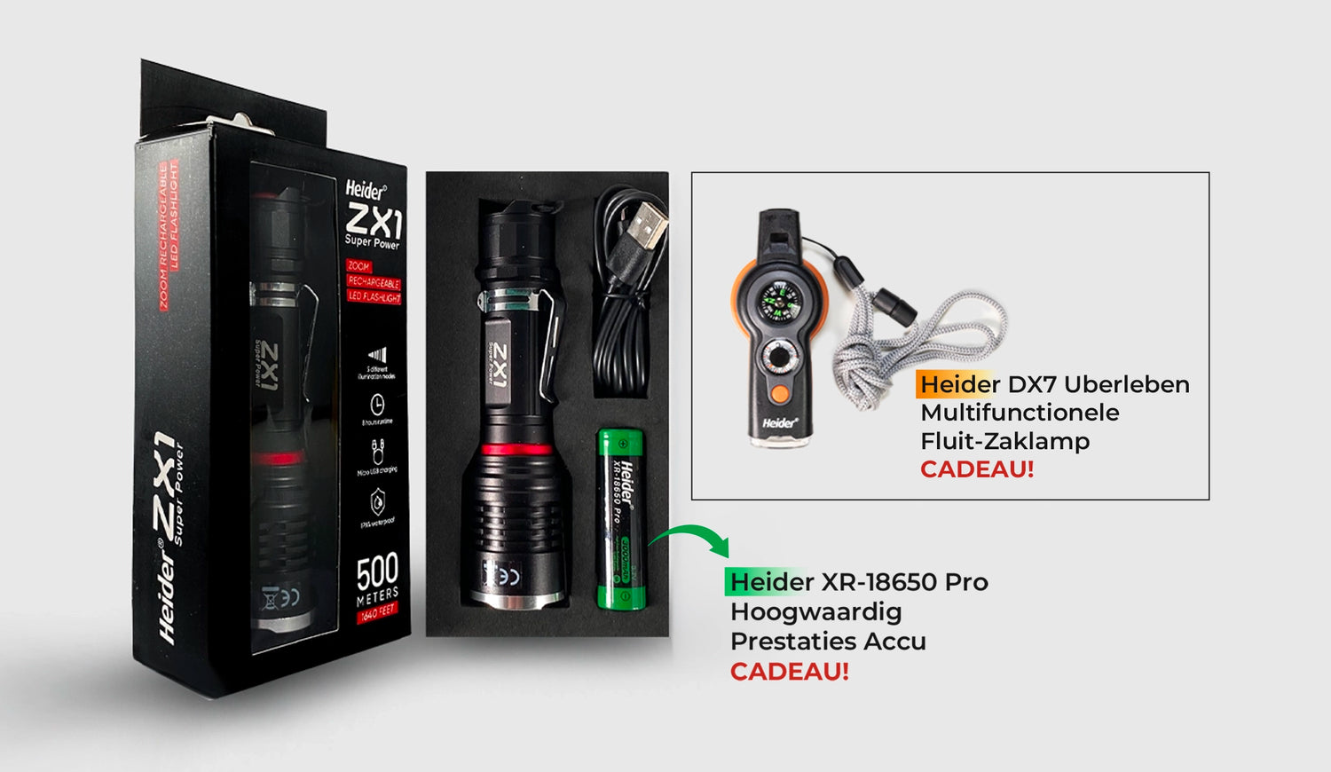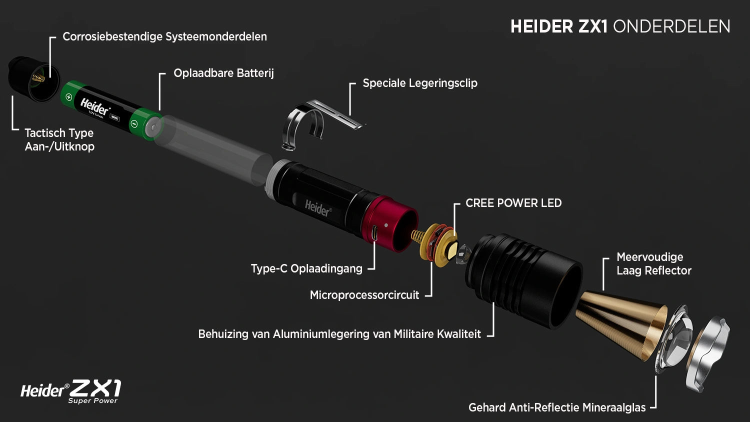De Heider ZX1 Super Power Zoom Flashlight wordt wereldwijd gebruikt als tactische zaklamp en voldoet aan militaire normen. De ZX1 onderscheidt zich door zijn betrouwbare prestaties, zelfs in barre weersomstandigheden, en is een ideale verlichtingsoplossing voor militair personeel, tactische eenheden, politie en brandweerteams.