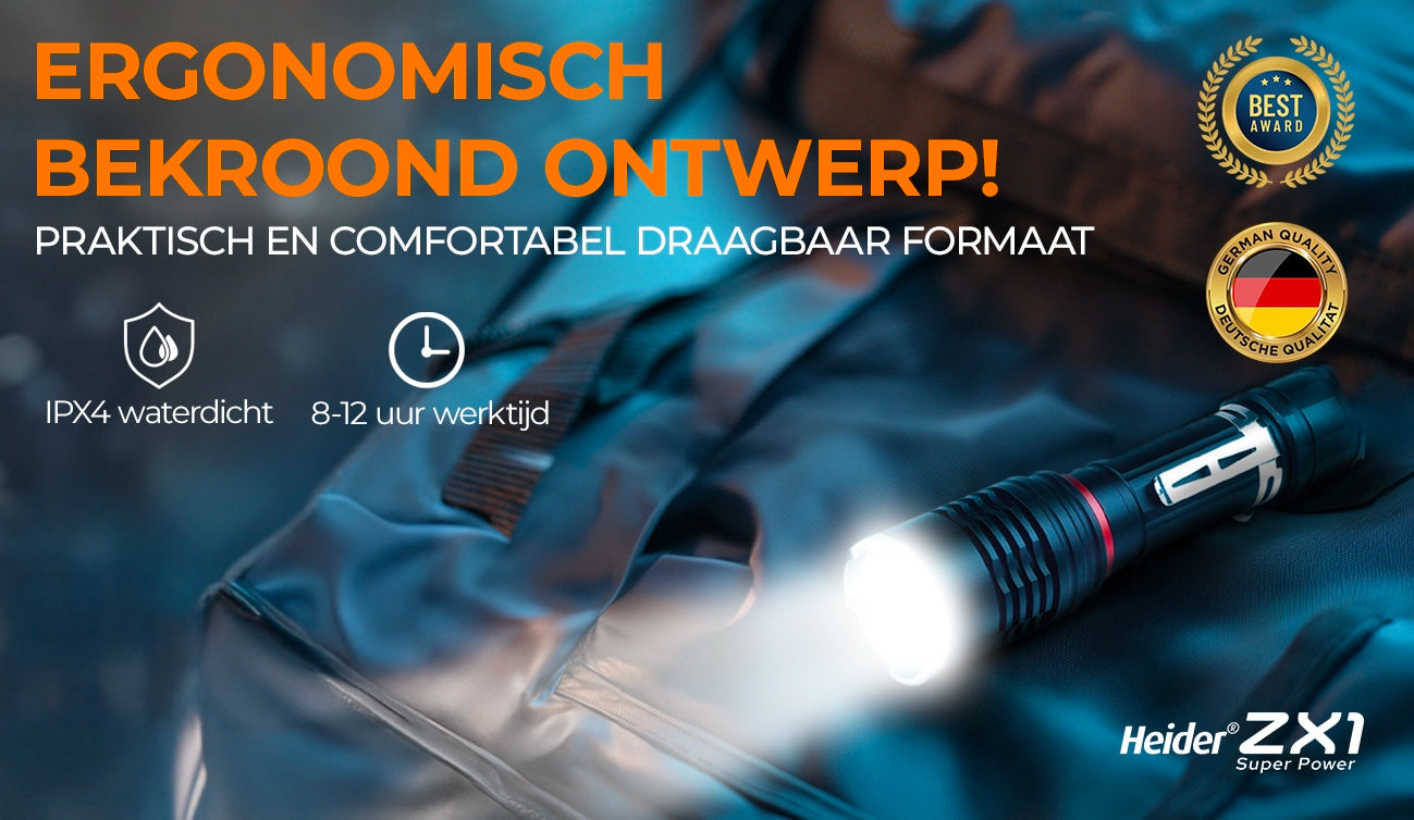 De HEIDER ZX1 is een zeer duurzame zaklamp, omdat hij bestand is tegen water en stoten.