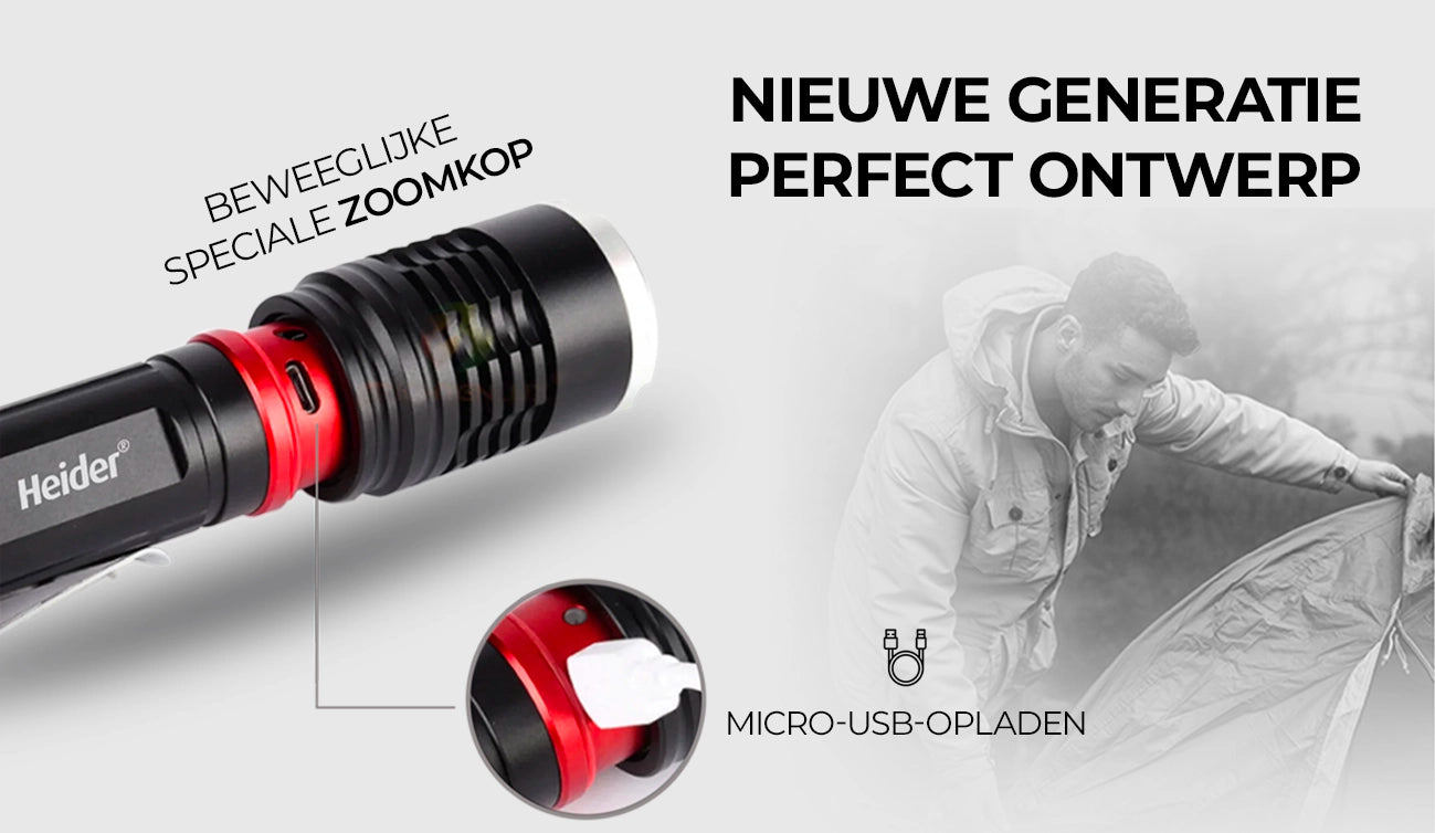 Het verstelbare siliconen zoomsysteem van de Heider ZX1 beweegt soepel heen en weer dankzij de speciale siliconen ring. Met slechts een zachte duw of trek kunt u overschakelen van een intense spotlight naar een breed gebiedsverlichting. Met de Heider ZX1 ligt de kracht van verlichting volledig in uw handen!