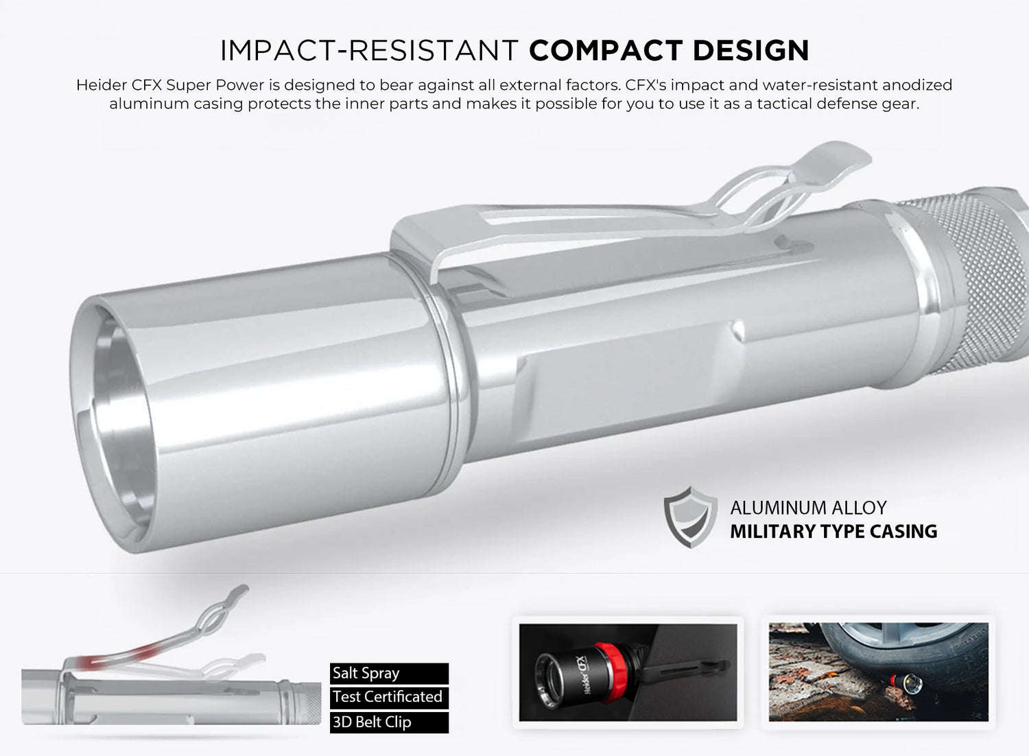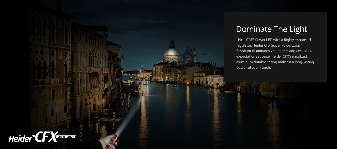 Heider CFX is equipped with CREE Power LED Technology with a special cut TIR lens. CFX Super Power has 220 hours of runtime in lowest mode per charge. Its power is not a coincidence, it’s the ultimate design.