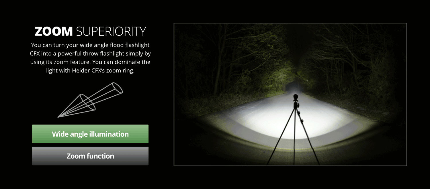 The Heider CFX is the most powerful zoom flashlight in its class. To transform your wide-angle Heider CFX flashlight into a powerful long-range flashlight, simply use the zoom feature.